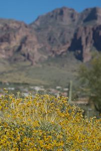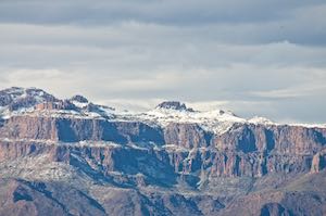 2,900万年前、アリゾナは海の底にあり、平坦な地表だった。その地表に少しづつ割れ目ができ始めた。地下からの圧力が大きくなり、ある日その割れ目から海水が内部に流れ込んだ。流れ込んだ海水は、内部の熱で蒸気となり、膨れ上がった。そうして、海底から次々と地割れが始まった。こうして大地殻変動は起こった。地上からマグマが吹き上がってきた。 地上から噴出した溶岩は、外気によって冷え、硬くなって岩山となる。これが、スーパースティション・マウンテンだ。この山の奇妙な形をした岩の塔は、その時にできたものが長い時間をかけて風と雨水による風化作用で形成されたのだ。 この山の標高は6,000フィート(1,829メートル)。冬は時々雪景色となる。 |